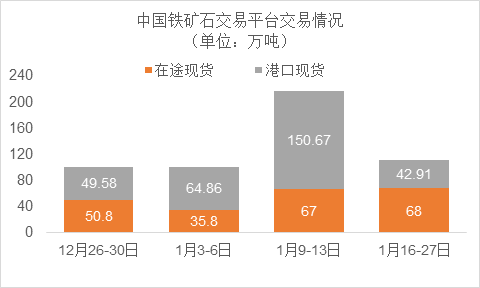 1月16日~1月27日成交36筆共110.91萬噸,其中在途5筆共68萬噸,港口31筆共42.91萬噸。主要成交品種包括:PB粉17筆共70萬噸,金布巴混合粉2筆共10.5萬噸,紐曼塊1筆共8萬噸,F(xiàn)MG超特粉4筆共7.12萬噸,麥克粉3筆共3.73萬噸,F(xiàn)MG混合粉3筆共3萬噸。