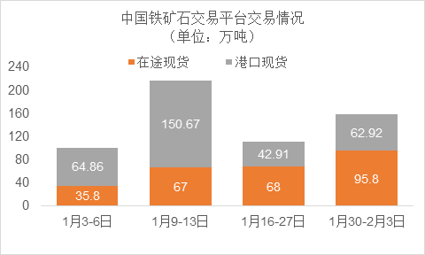 1月30日~2月3日成交64筆共158.72萬噸,其中在途8筆共95.8萬噸,港口56筆共62.92萬噸。主要成交品種包括:PB粉16筆共48萬噸,金布巴混合粉3筆共27萬噸,揚迪粉2筆共16萬噸,紐曼粉3筆共3.2萬噸,麥克粉3筆共10.2萬噸,F(xiàn)MG超特粉6筆共3.4萬噸, FMG混合粉6筆共23.9萬噸。
