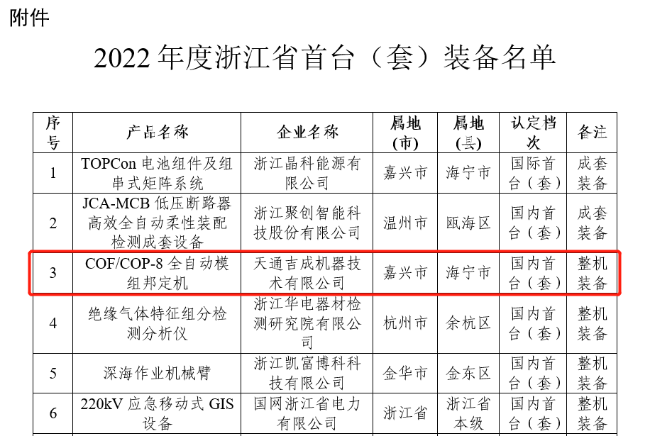 近日,2022年度浙江省首臺(套)裝備名單出爐,天通公司繼去年實現(xiàn)海寧市國家級首臺(套)零的突破后,今年又一項重大技術(shù)裝備“上榜”——天通吉成機(jī)器技術(shù)有限公司COF/COP-8全自動模組邦定機(jī)被認(rèn)定為國內(nèi)首臺(套)裝備。